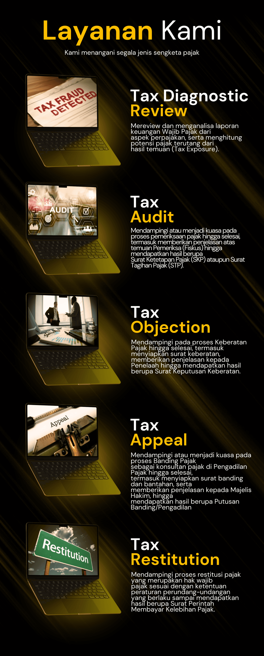 Mereview dan menganalisa laporan keuangan Wajib Pajak dari aspek perpajakan, serta menghitung potensi pajak terutang dari hasil temuan (Tax Exposure).
